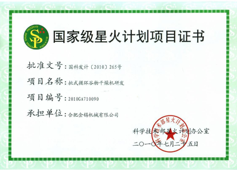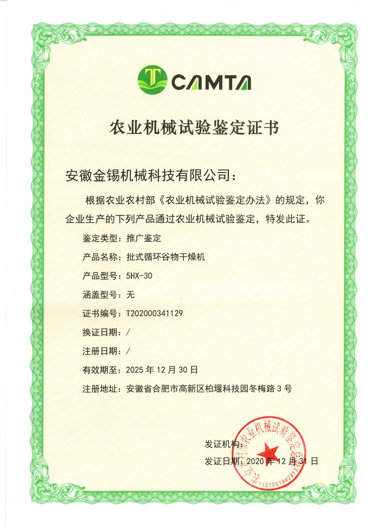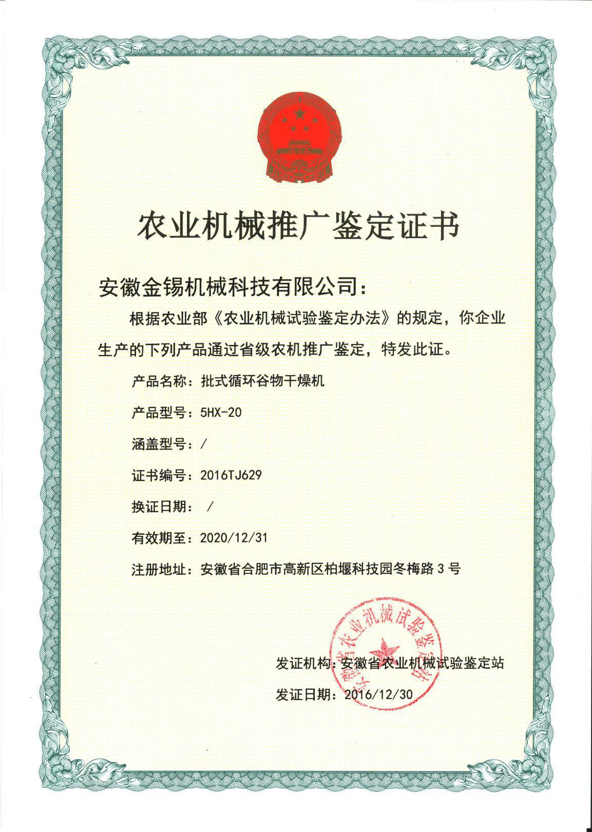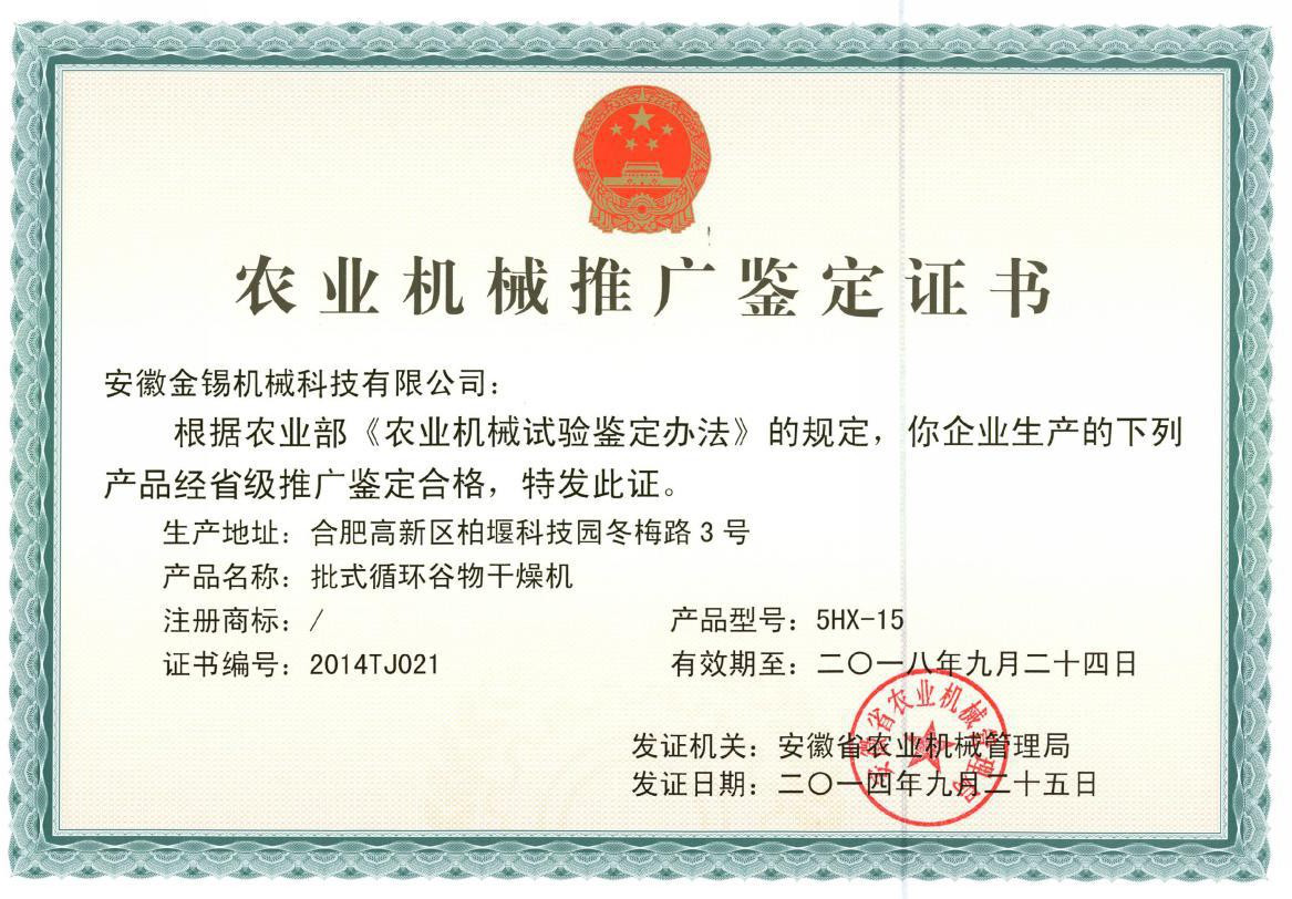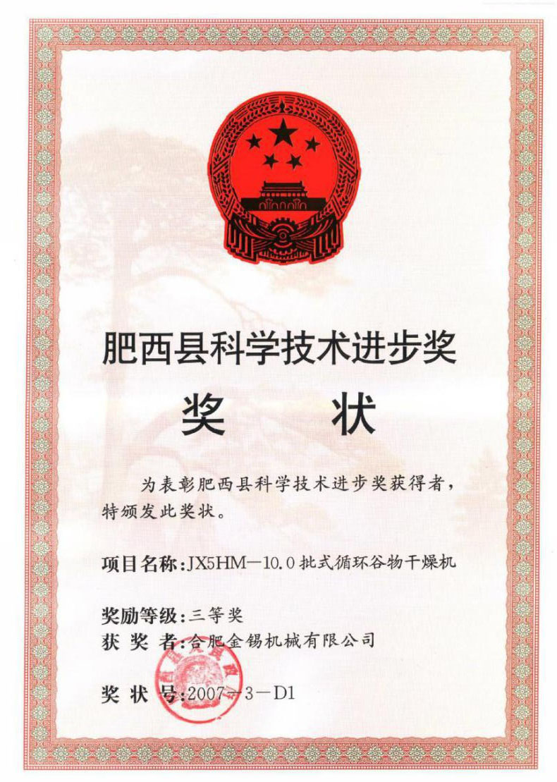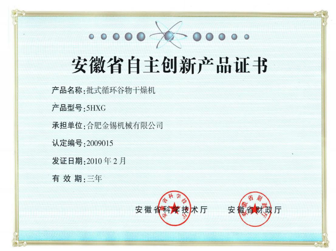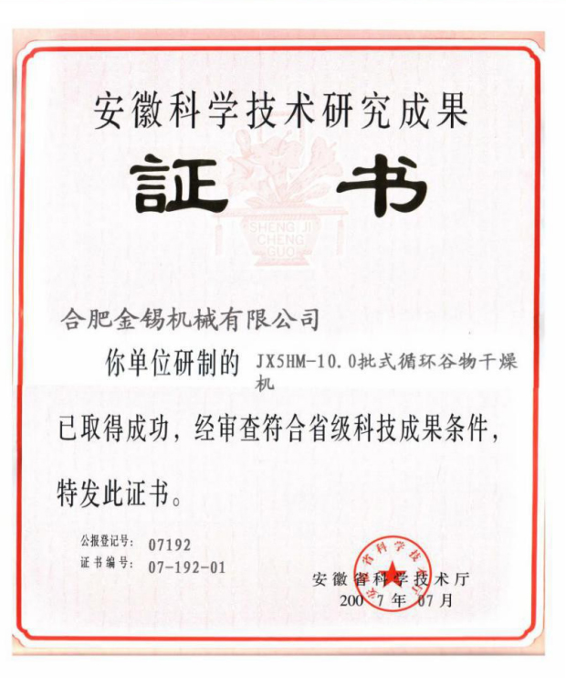 國內(nèi)首臺自主研發(fā)JX5HM-10.0型低溫循環(huán)式干燥機(jī)經(jīng)省農(nóng)機(jī)局、省鑒定站組織鑒定獲省級農(nóng)業(yè)機(jī)械推廣鑒定證書;獲省經(jīng)濟(jì)委員會認(rèn)定“安徽省新產(chǎn)品”證書